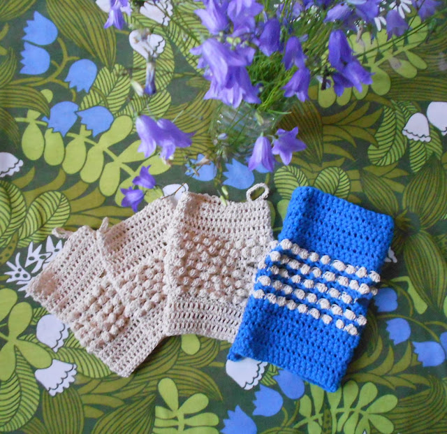Kotimatkalla poimin kimpun kissankelloja. Tässäpä olisi hyvä tuliainen ystävälle saunomaan mennessä, kimppu kissankelloja ja kesäiset pesukintaat. Pesukintaista löytyy lisää tietoa Virkkuukoukulla tehtyä sivulta.