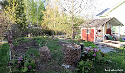 Kasvihuoneelta kuljetaan omenapuiden alitse talon länsipuolelta leikkimökille. Leikkimökki kylpee ilta-auringossa. Kuusiaidan varjoon jää jätevesien suodatuskentän päälle perustettu matalajuuristen värikasvien ja yrttien penkki. Suodatuskentän ilmastointiputket olen naamioinut kirppareilta hankkimillani pajukoreilla. Vuorenkilvet kukkivat kentän jyrkässä pengereessä. Etupihalla kasvaa pitkä penkki herttavuorenkilpeä. Sen talven aikana fermentoituneita lehtiä käytämme teeaineksina ns. siperian teenä. Nyt vielä voi kerätä tummentuneita, kuivia lehtiä teepannuun tai fermentoida nuoria vihreitä lehtiä itse. Olen kirjoittanut siitä aiemmin täällä klik! hieman enempi.